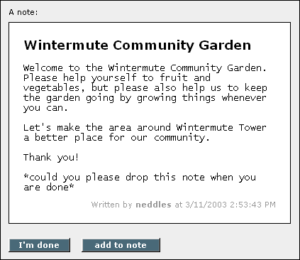 I've been reading the GNE museum site and I've been surprised by how many elements from GNE, have been transfered to Glitch, (even worded, like in the encyclopedia descriptions). Anyway, I saw this note of somewhere called the Wintermute Community Garden... www.gnespy.com/museum/read_...